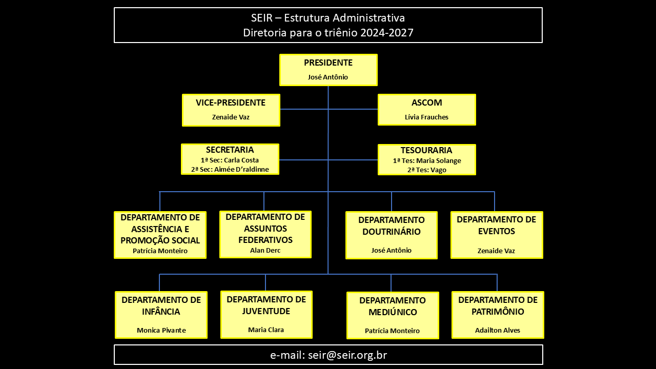 As atividades administrativas, doutrinárias, espirituais e assistenciais da Seir estão assim estruturadas: